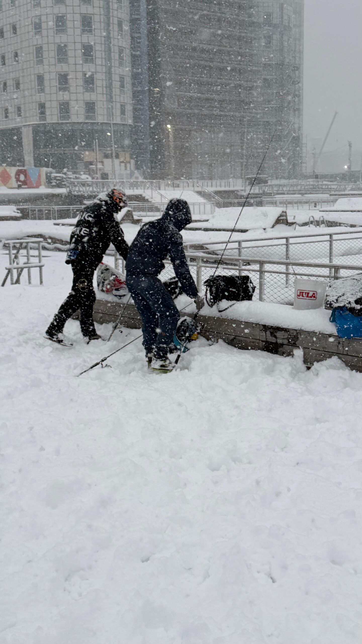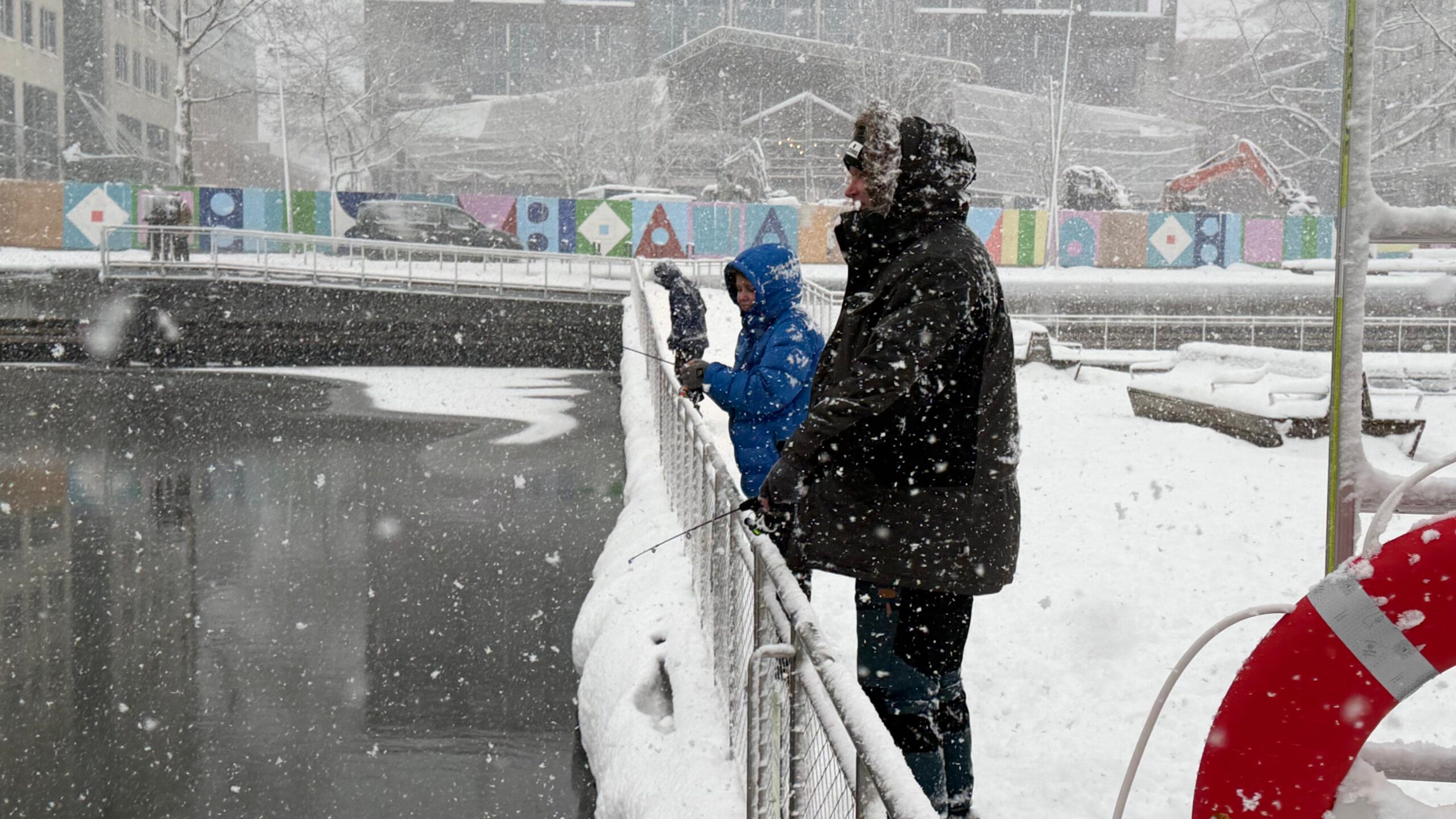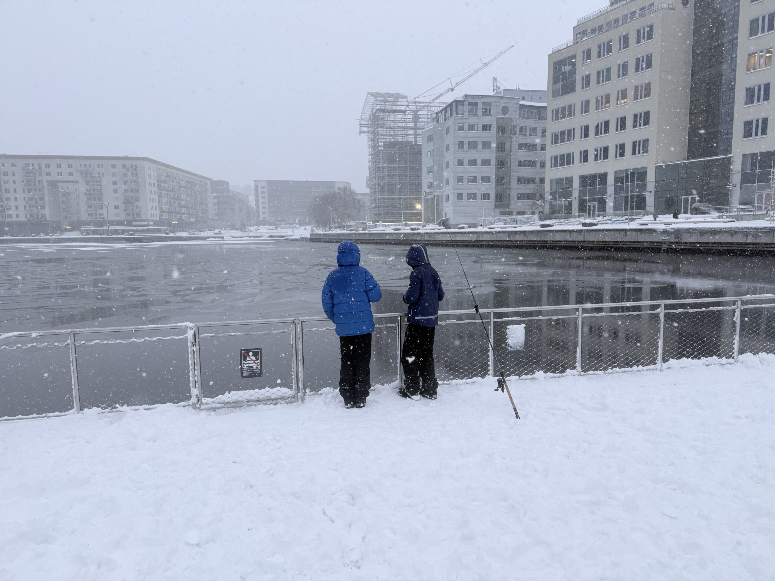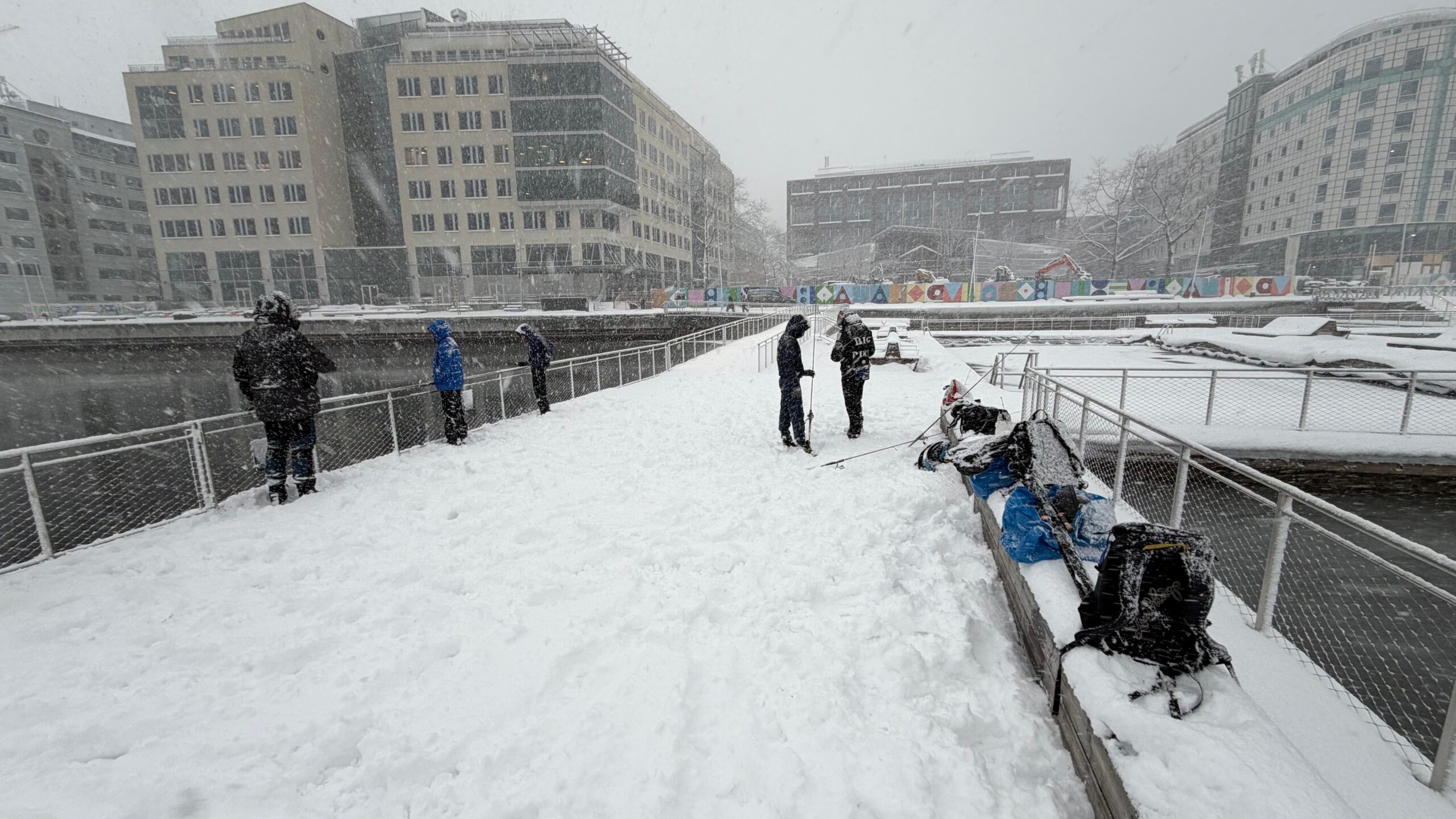 Förhållandena var ganska svåra idag. Mycket snö, hala bryggor och iskanter gjorde att vi fick tänka till lite extra. Vi pimplade och kastade, men den här gången ville ingen fisk bita.